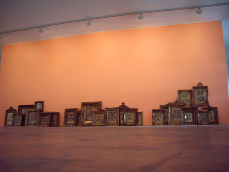 27 components: gold leaf, acrylic, shellac and wax on ply and antique frames, salmon pink house paint.